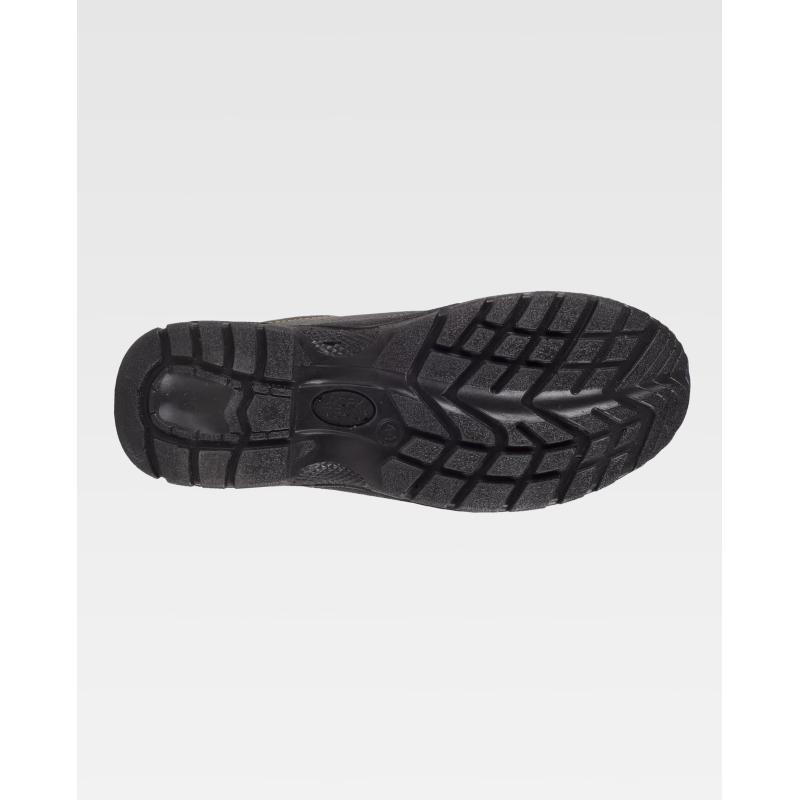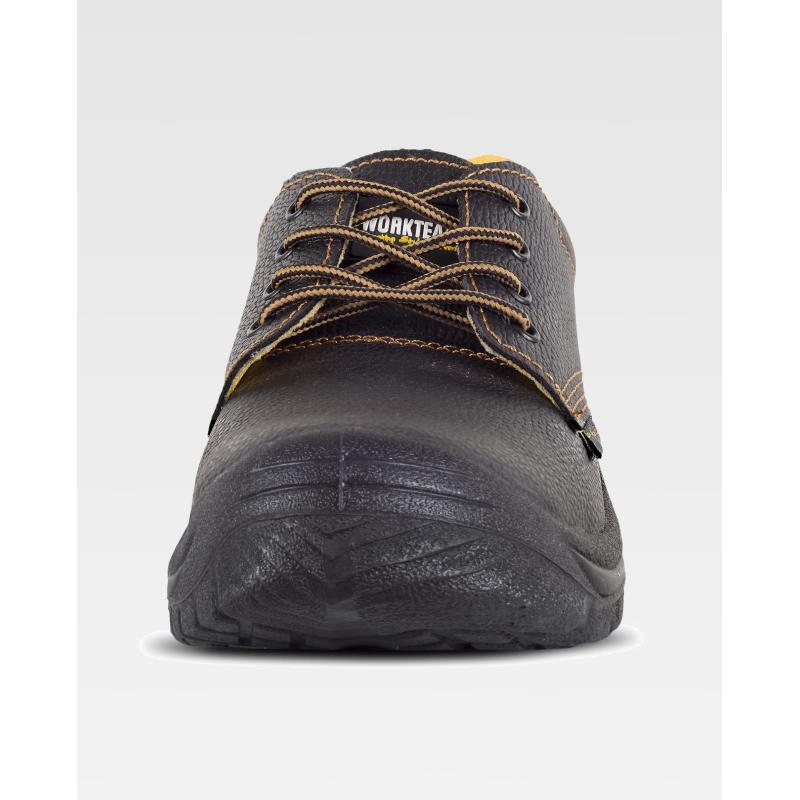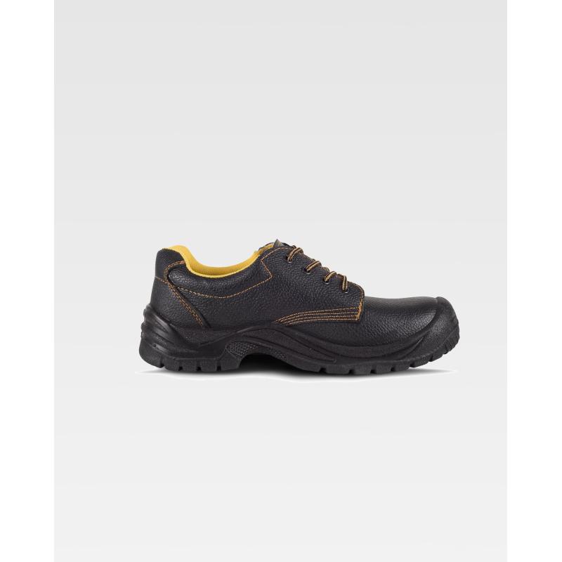Zapato de piel hidrofugado con cordones. Suela PU bidensidad. Puntera y plantilla de acero. Propiedades antiestáticas. Absorción de la energía en la zona del tacón. Resistente a los hidrocarburos. Resistente a la perforación. Resistencia al deslizamiento sobre baldosa cerámica con disolución de jabón y sobre acero con glicerina. S1P SRC. Piel