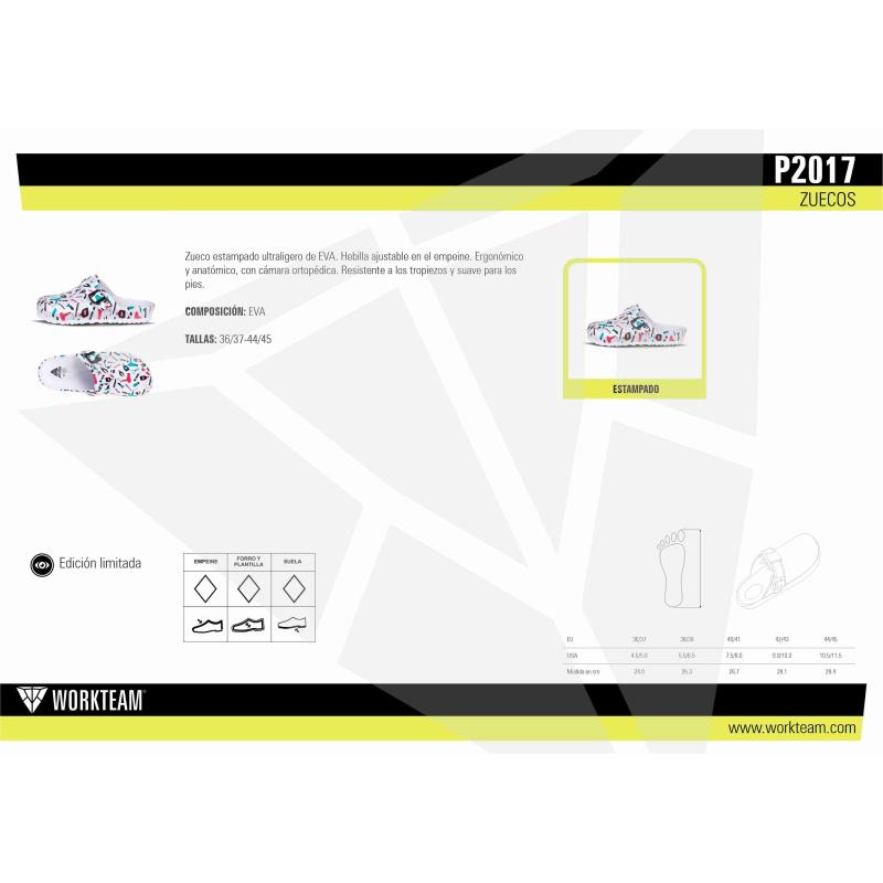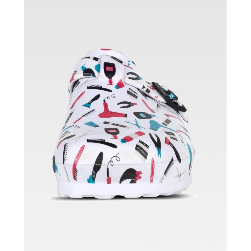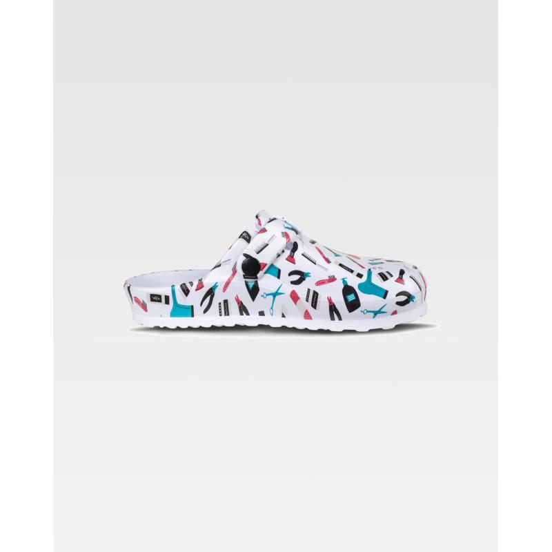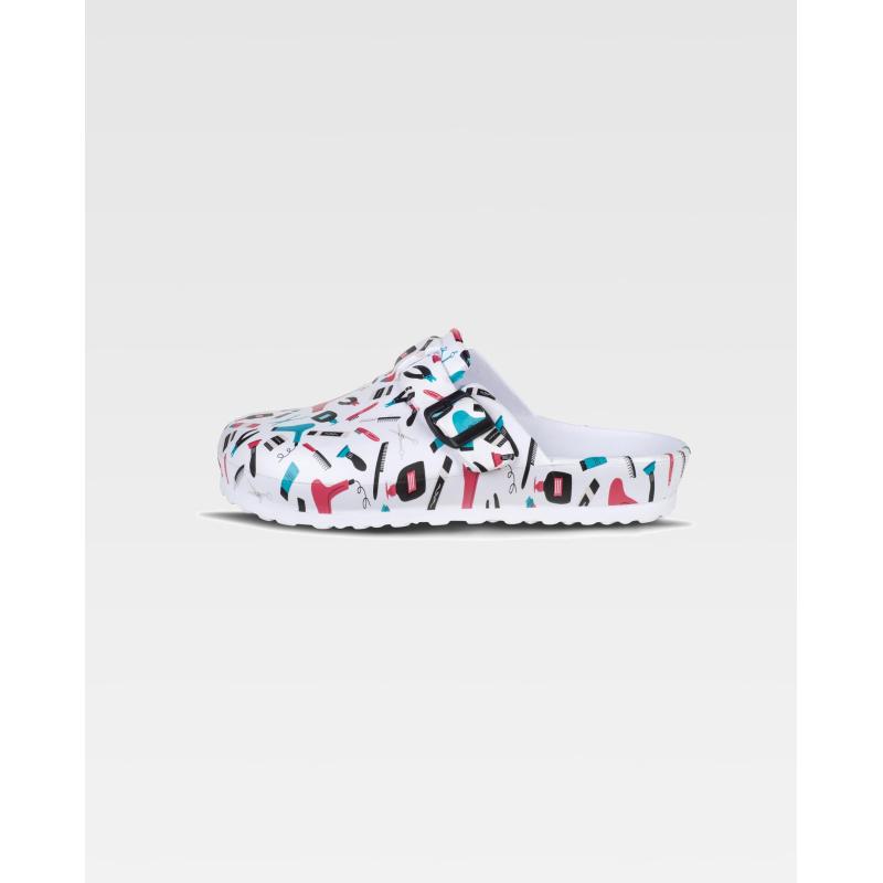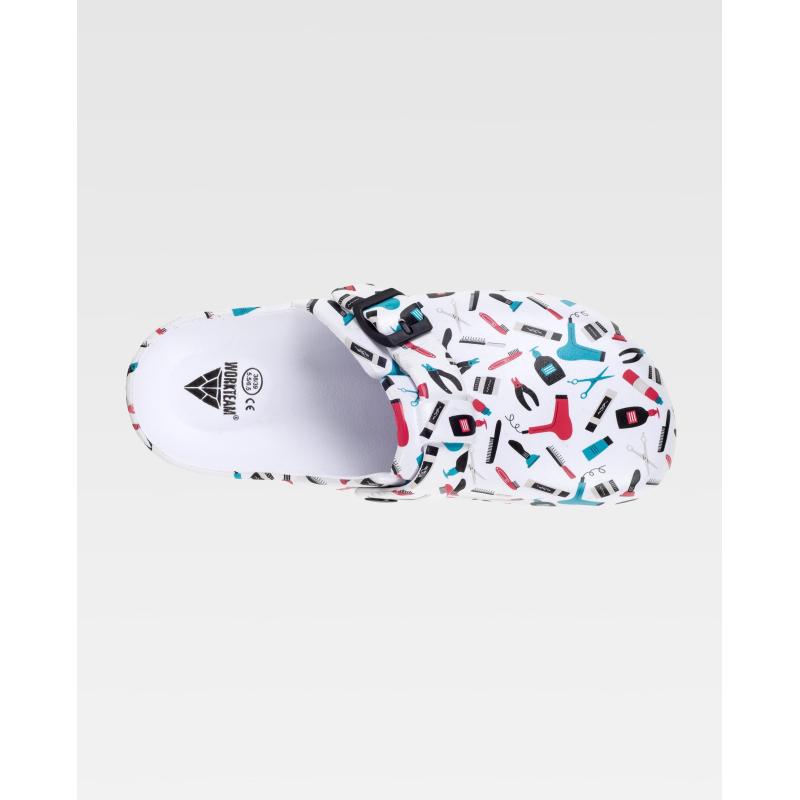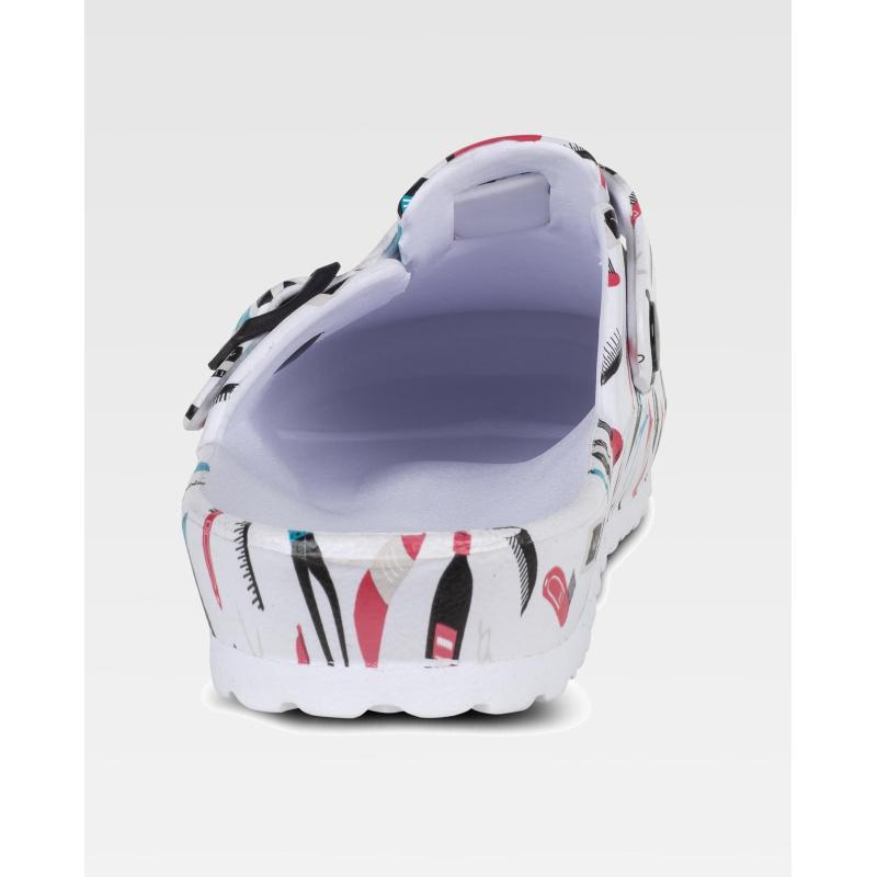Zueco estampado ultraligero de EVA. Hebilla ajustable en el empeine. Ergonómico y anatómico, con cámara ortopédica. Resistente a los tropiezos y suave para los pies. EVA