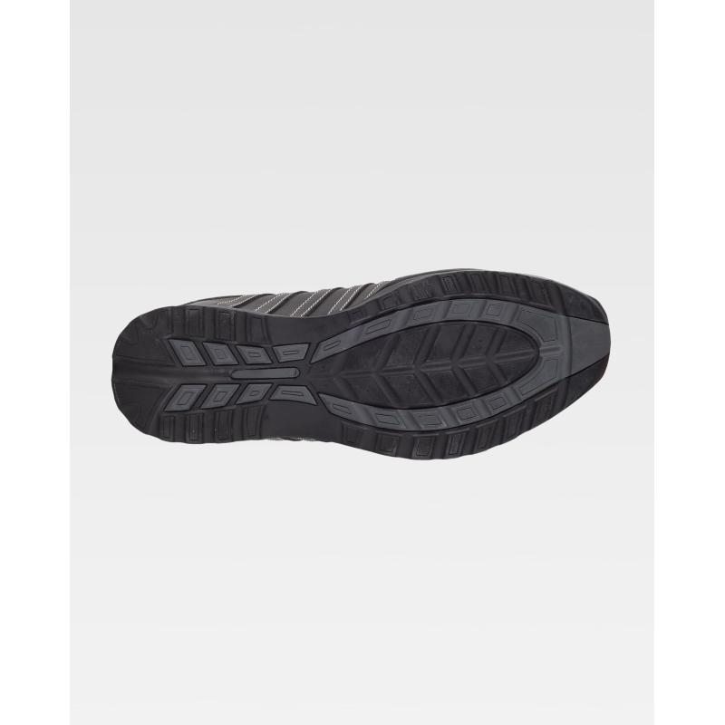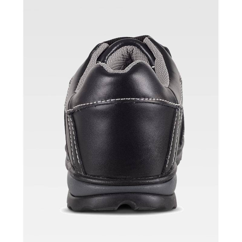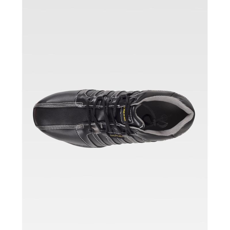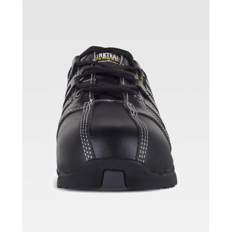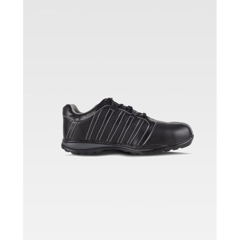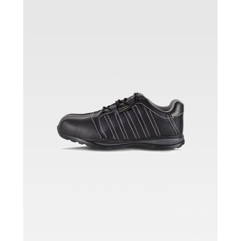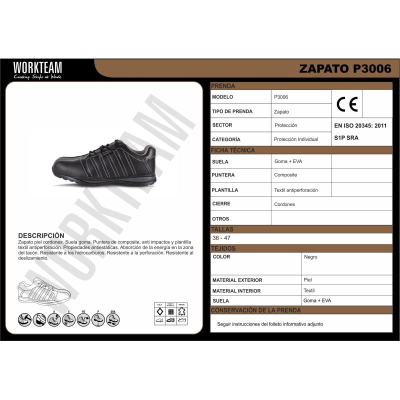 Zapato piel cordones. Suela de goma. Puntera de composite anti impactos y plantilla textil antiperforación. Propiedades antiestáticas. Absoricón de la energía en la zona del tacón. Resistente a los hidrocarburos. Resistente a la perforación. Resistente al deslizamiento sobre baldosa cerámica con disolución de jabón. S1P SRA. Piel