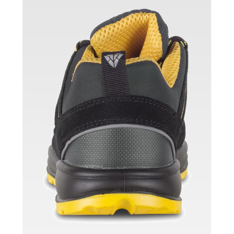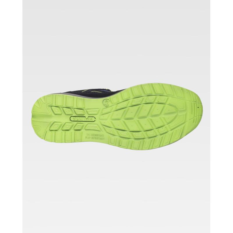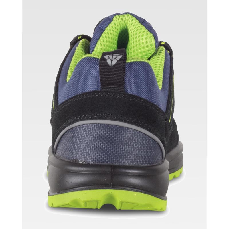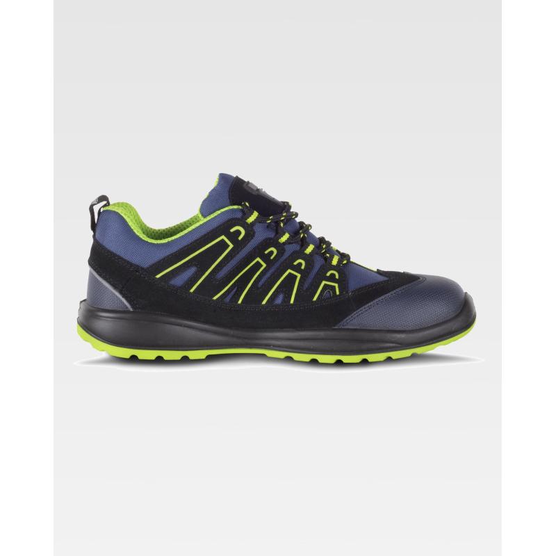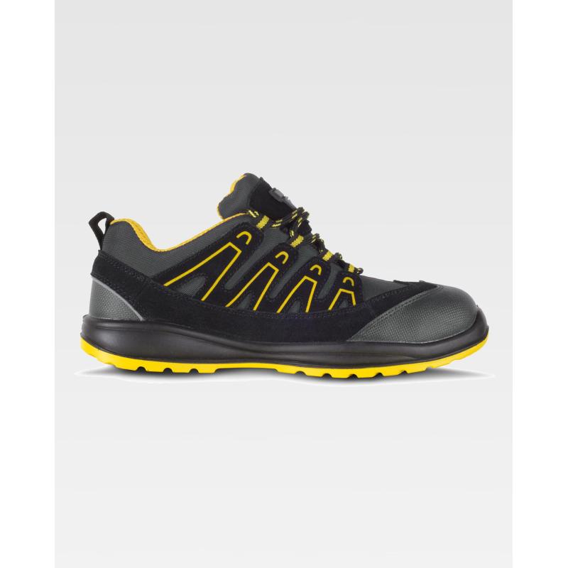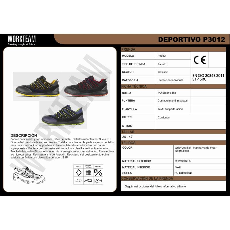 Zapato combinado y con cordones. Libre de metal. Detalles reflectantes. Suela PU bidensidad combinada en dos colores. Trabilla para tirar en la parte superior del talón para mayor comodidad al ponérsela. Paneles laterales combinados con capas superpuestas. Puntera de composite anti impactos y plantilla textil antiperforación. Propiedades antiestáticas. Absorción de la energía en la zona del tacón. Resistente a los hidrocarburos. Resistente a la perforación. Resistencia al deslizamiento sobre baldosa cerámica con disolución de jabón y acero con glicerina. S1P SRC. Piel / Nylon / Poliéster / PU