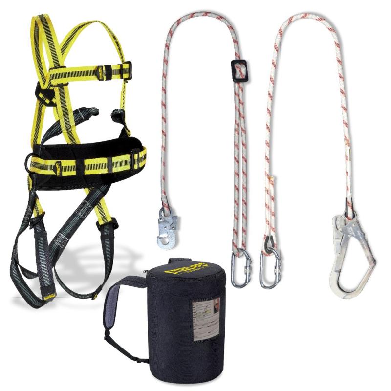 Arnés STEELTEC-1 con enganche dorsal y frontal con cinturón de posicionamiento (1888ACSIN), cuerda regulable con mosquetones (1888CURMSIN), cuerda de 1,5 metros (1888CU15MSIN) y mochila tejido Oxford (1888BAGSIN).