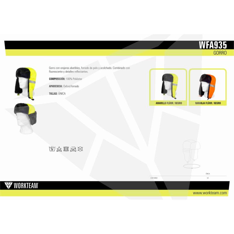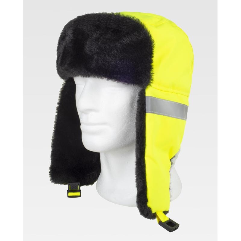 Gorro con orejeras abatibles, forrado de pelo y acolchado. Combinado con fluorescente y detalles reflectantes. 100% Poliéster