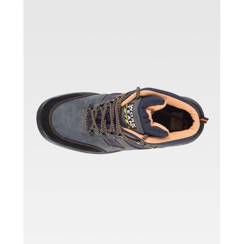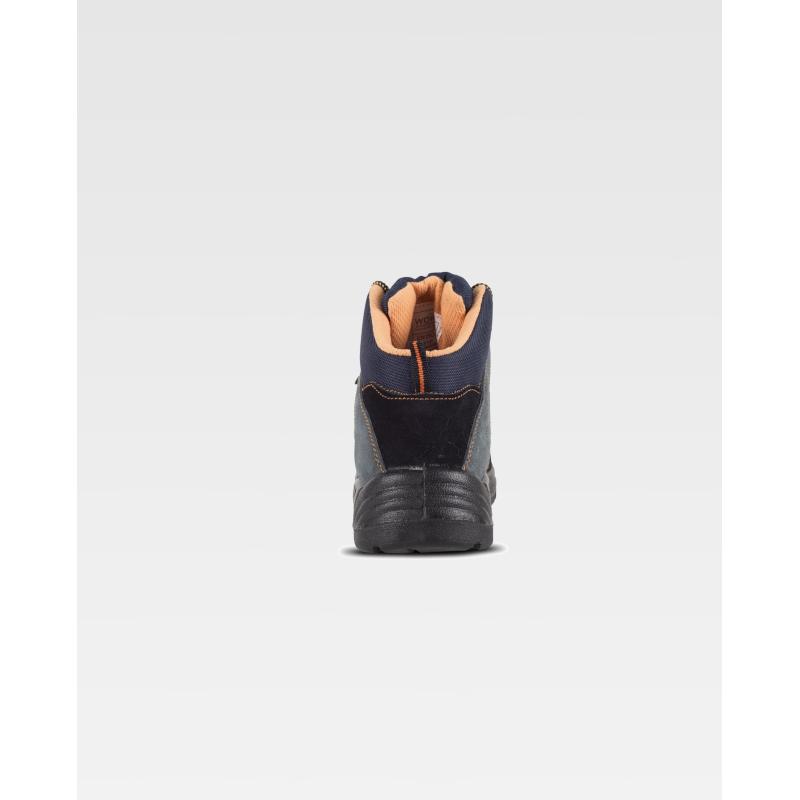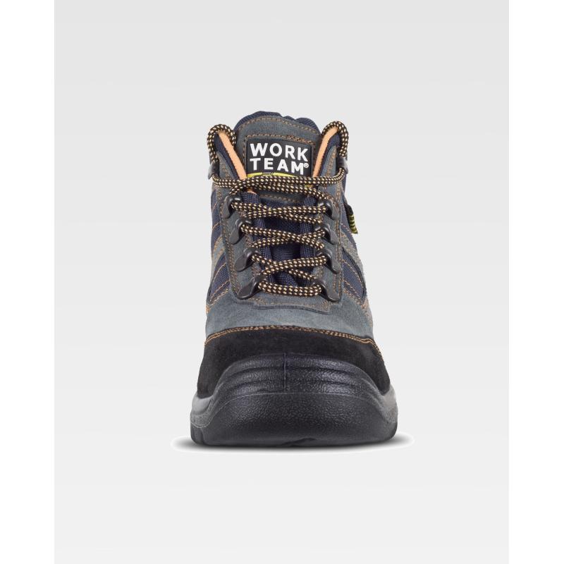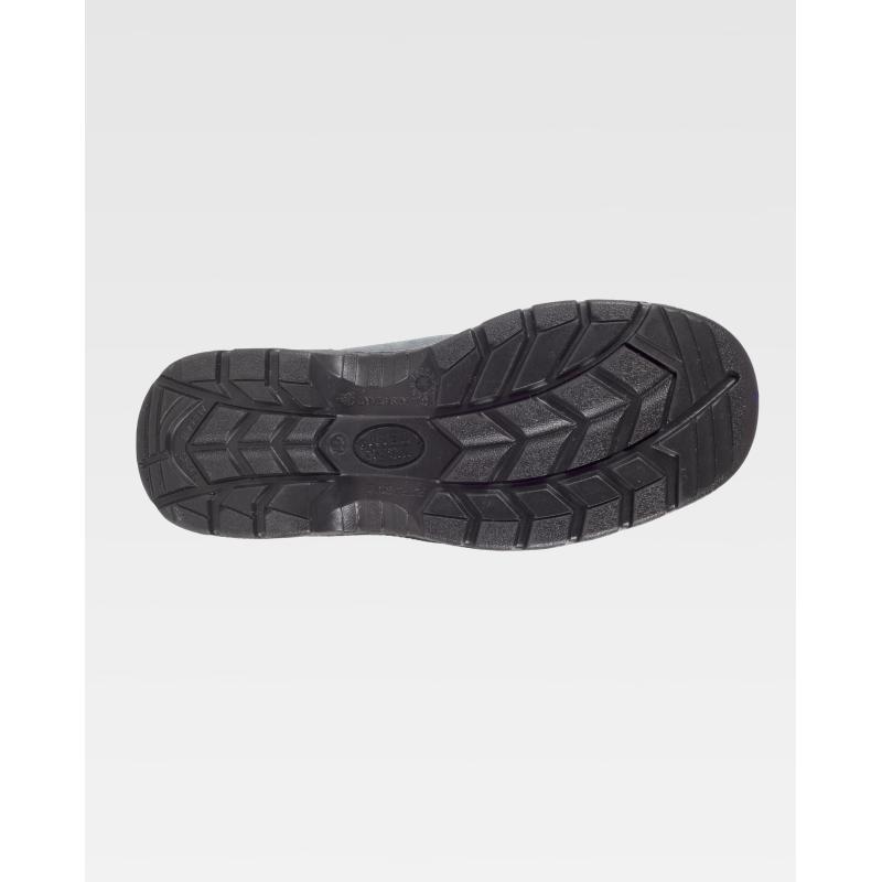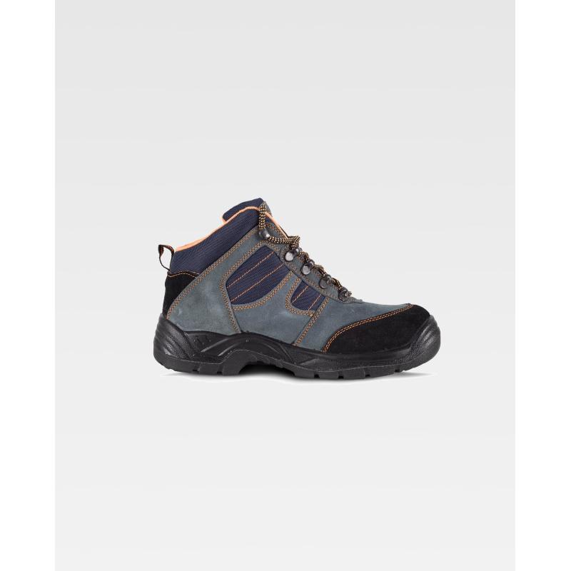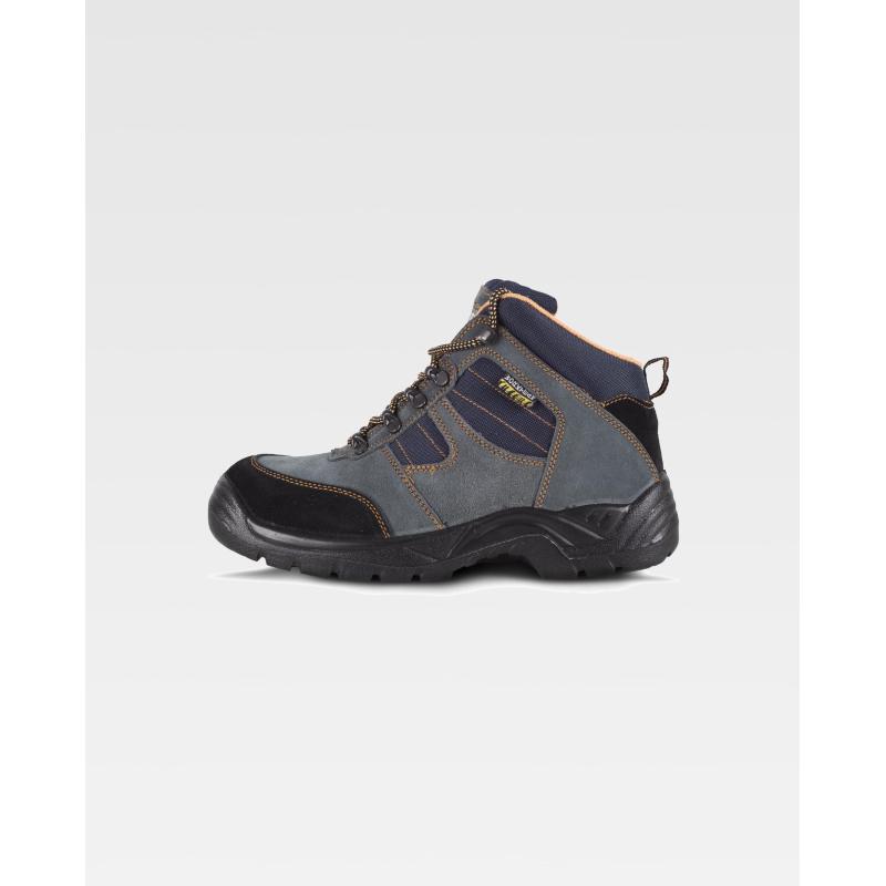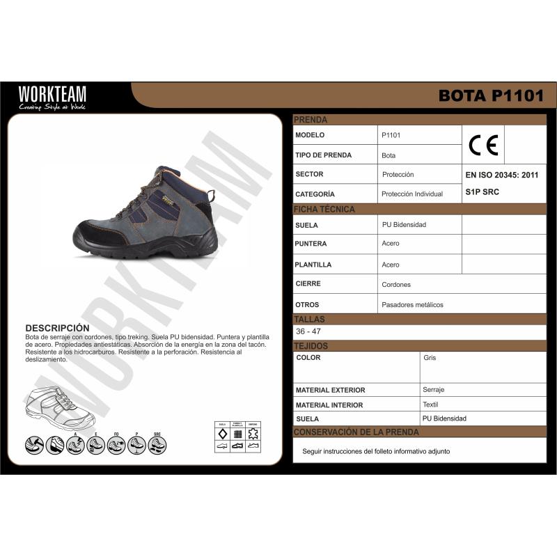 Bota de serraje con cordones. Tipo treking. Suela PU bidensidad. Puntera y plantilla de acero. Propiedades antiestáticas. Absorción de la energía en la zona del tacón. Resistente a los hidrocarburos. Resistente a la perforación. Resistencia al deslizamiento sobre baldosa cerámica con disolución de jabón y sobre acero con glicerina. Piel Serraje