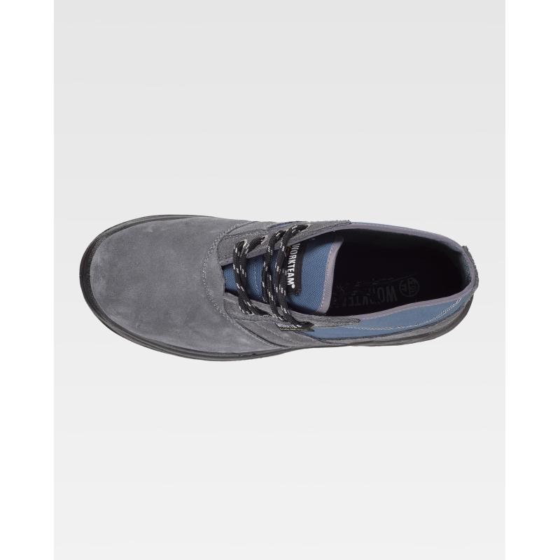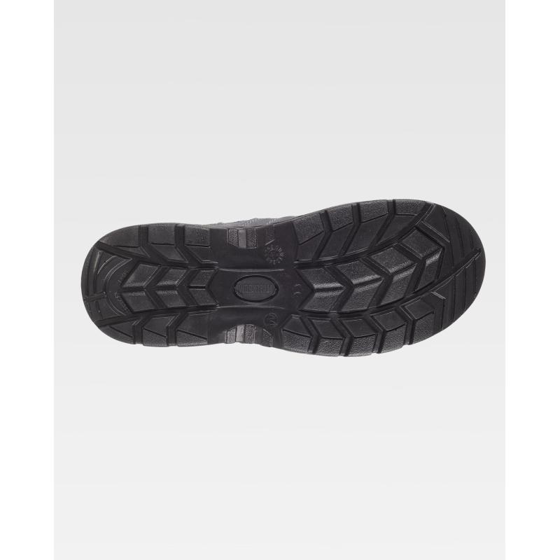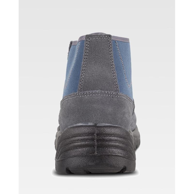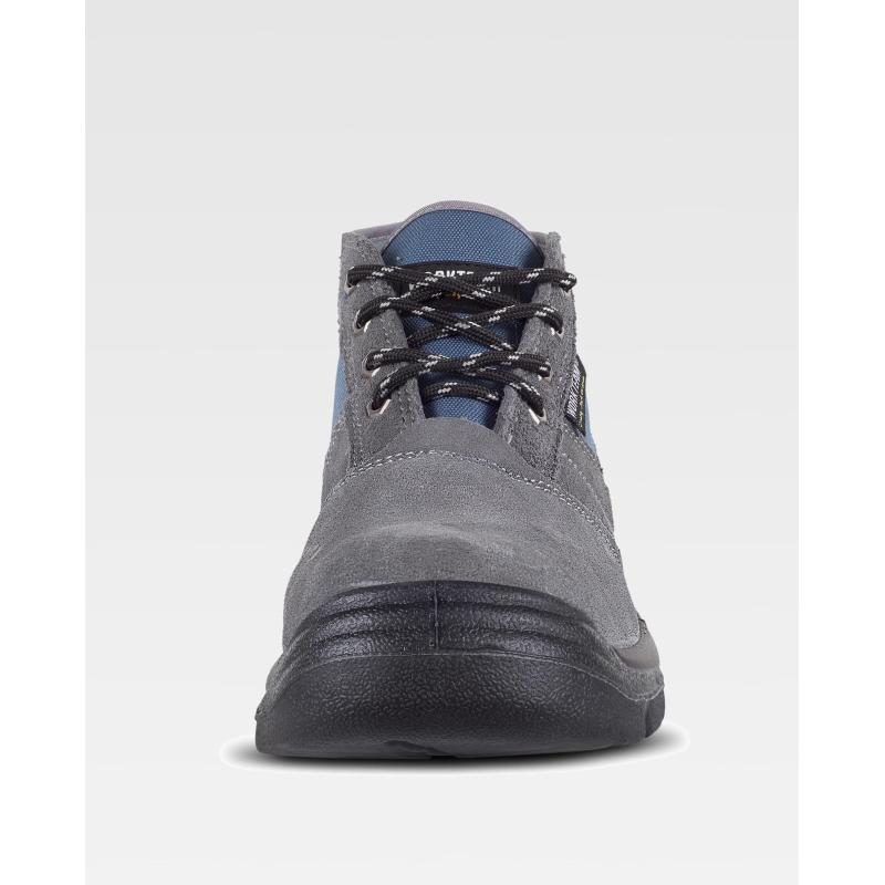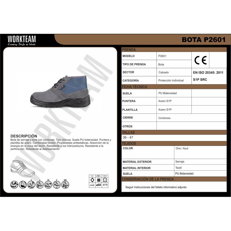 Bota de serraje y lona con cordones. Tipo chiruca. Suela PU bidensidad. Puntera y plantilla de acero. Propiedades antiestáticas. Absorción de la energía en la zona del tacón. Resistente a los hidrocarburos. Resistente a la perforación. Resistencia al deslizamiento sobre baldosa cerámica con disolución de jabón y sobre acero con glicerina. Piel Serraje
