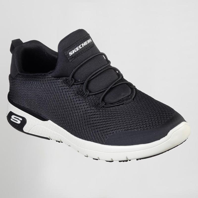 - Suela exterior antideslizante (SR) para una mayor tracción en superficies mojadas, secas, aceitosas y grasientas.- Plantilla acolchada Skechers Memory Foam™ para mayor comodidad.- No Tie Fit™: los cordones nunca se desatan.- Parte superior sintética lisa con detalles de costuras y cordones elásticos en la parte delantera.- Entresuela flexible y ligera que absorbe los impactos.- Altura del tacón: 2,5 cm.- Detalle del logotipo de Skechers®.