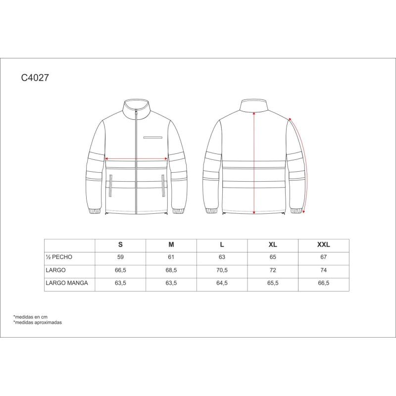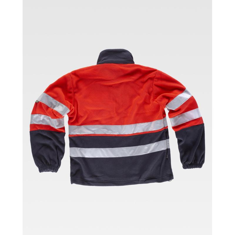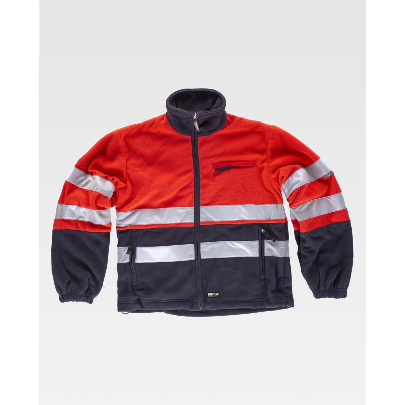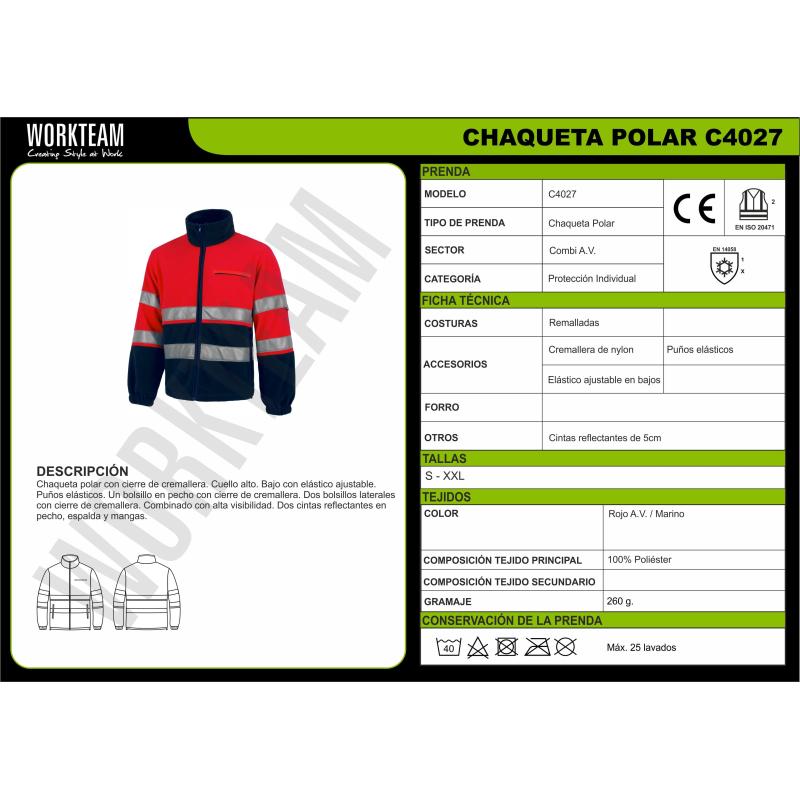 Chaqueta polar combinada con cintas reflectantes. Parte superior de alta visibilidad. Cuello alto y cierre de cremallera de nylon. Un bolso de pecho y dos bolsos laterales interiores con cremallera de nylon. Dos cintas reflectantes en pecho, espalda y mangas. Puño con elástico. Cordón elástico con pieza ajustable en cintura. 100% Poliéster