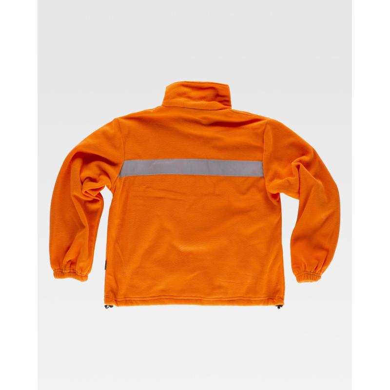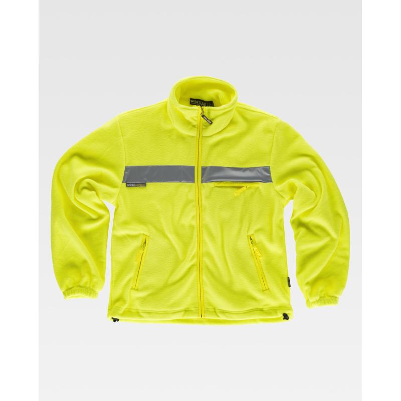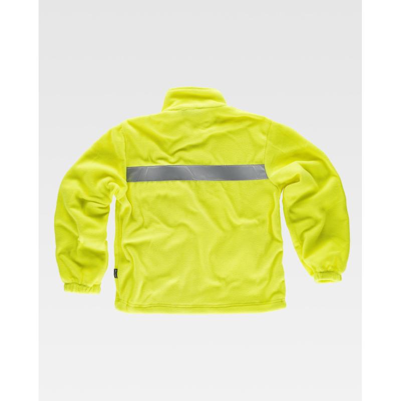 Chaqueta polar de alta visibilidad con cintas reflectantes. Cuello alto y cierre de cremallera de nylon. Un bolso de pecho y dos bolsos laterales interiores con cremalleras de nylon. Una cinta reflectante en pecho y espalda. Puño con elástico. Cordón elástico con pieza ajustable en bajo. 100% Poliéster