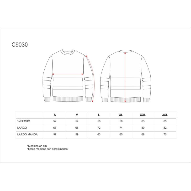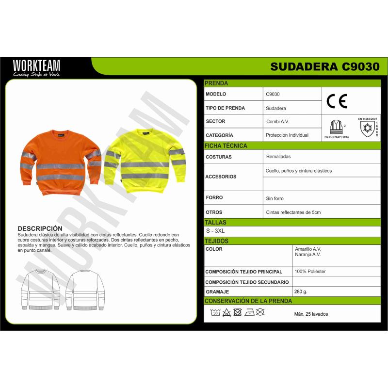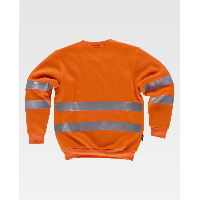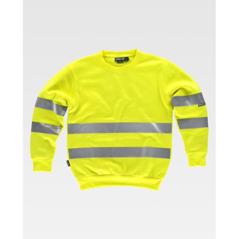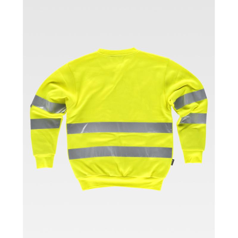 Sudadera clásica de alta visibilidad, de cuello redondo con cintas reflectantes. Cubre costuras en el interior del cuello y costuras reforzadas. Dos cintas reflectantes en pecho, espalda y mangas. Suave y cálido acabado en el interior. Cuello, puños y cintura elásticos en punto canalé. 100% Poliéster