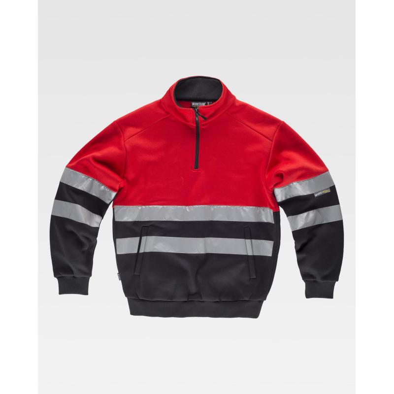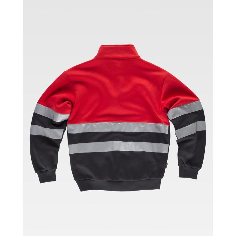 Sudadera combinada con cintas reflectantes. Cuello alto con cierre de media cremallera y costuras reforzadas. Dos bolsos laterales interiores. Dos cintas reflectantes en pecho, espalda y mangas. Suave y cálido acabado en el interior. Puños y cintura elásticos en punto canalé. 80% Poliéster 20% Algodón