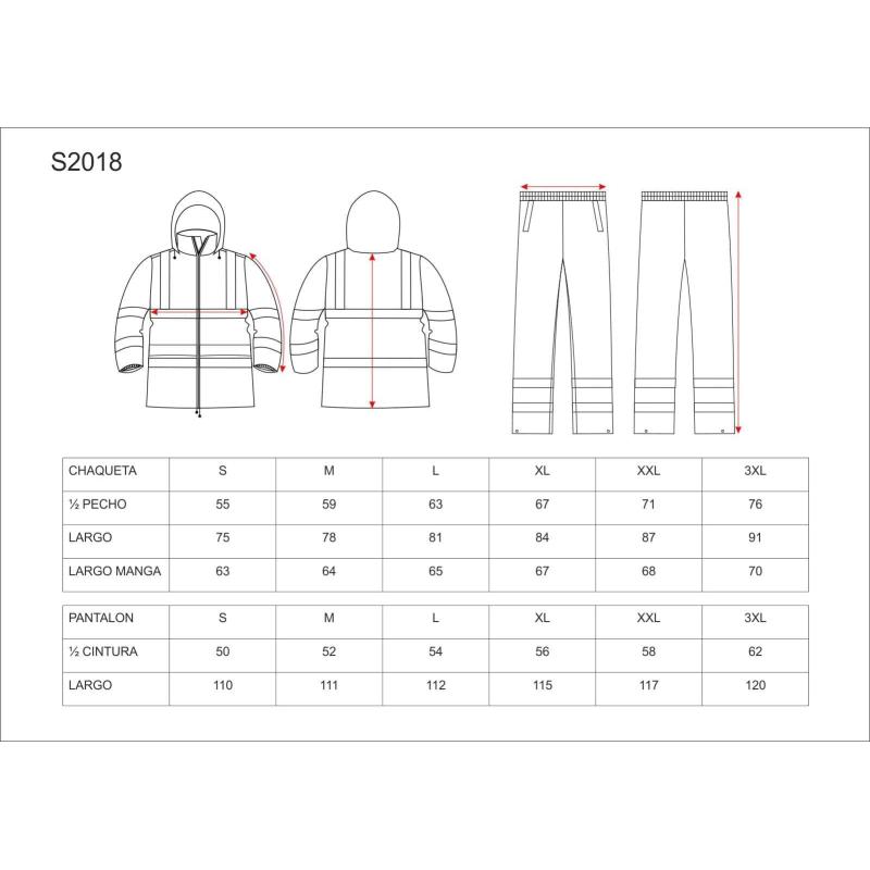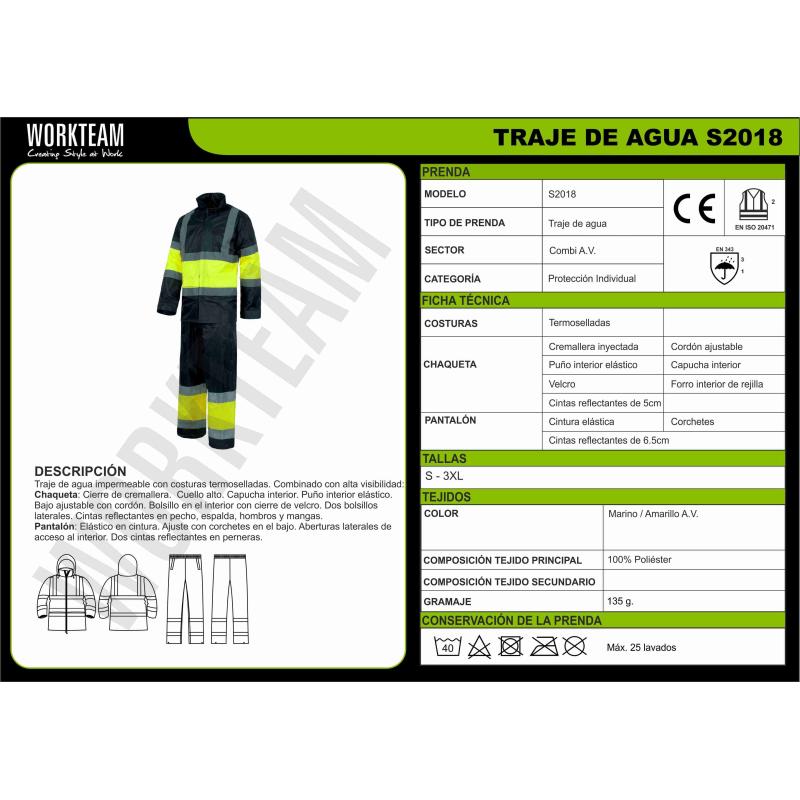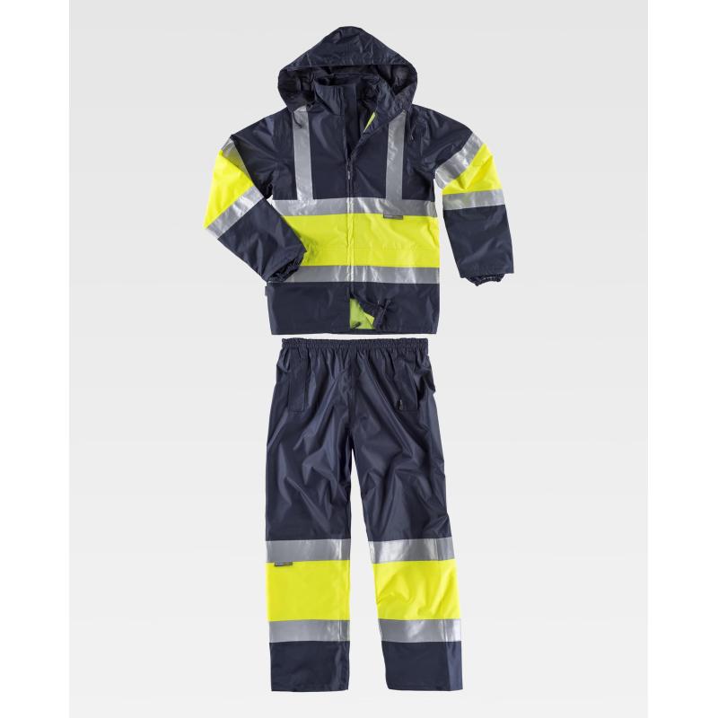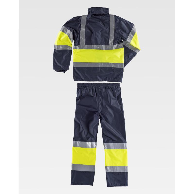 Traje de agua impermeable, combinado y con cintas reflectantes. Parte superior: Impermeable con cierre de cremallera. Cuello alto con capucha interior ajustable con cordón. Dos bolsos laterales solapados. Un bolso de pecho de plastón con velcro en el interior. Una cinta reflectante en hombros y dos en pecho, espalda y mangas con pieza central de alta visibilidad. Puño elástico en el interior de la manga. Bajo ajustable con cordón. Forro interior de rejilla. Parte inferior: Pantalón impermeable con cintura elástica. Dos cintas reflectantes en perneras con pieza central de alta visibilidad. Aberturas laterales de acceso al interior. Bajo ajustable con corchetes. 100% Poliéster