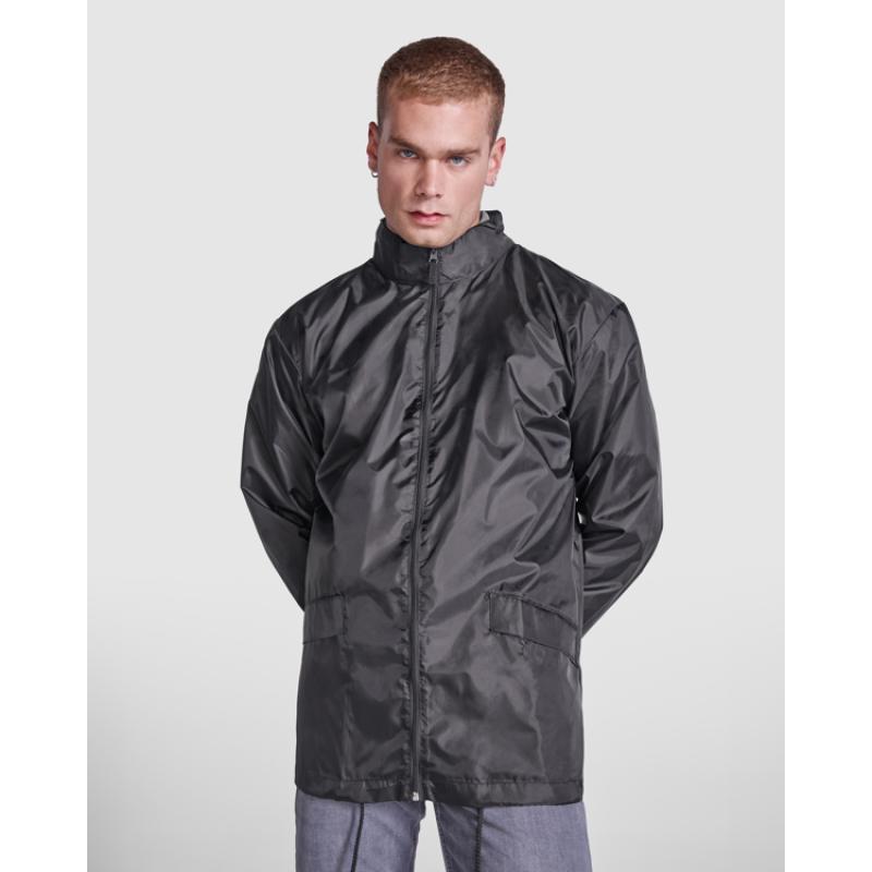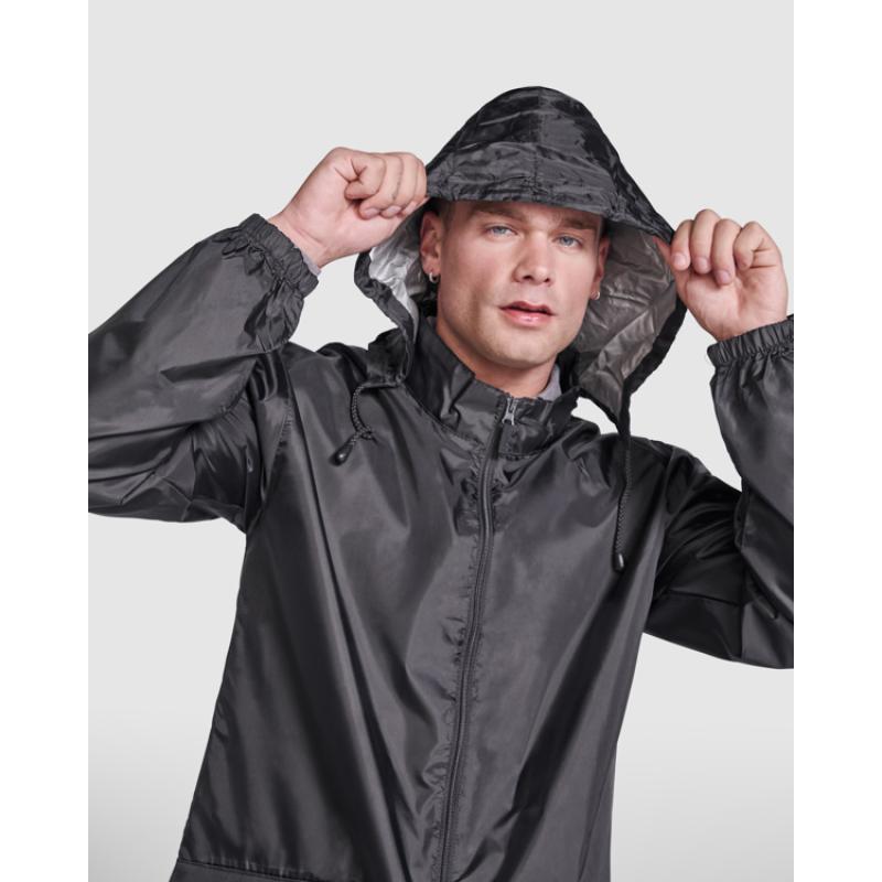 Chubasquero con cuello alto y capucha extraíble con cordón ajustable. Interior con revestimiento de plata. Cremallera frontal al tono. Bolsillos laterales con cremallera cubiertos por solapa del mismo tejido. Puños elásticos. Bajo con cordón interno ajustable. Goma en bolsillo para su plegado.